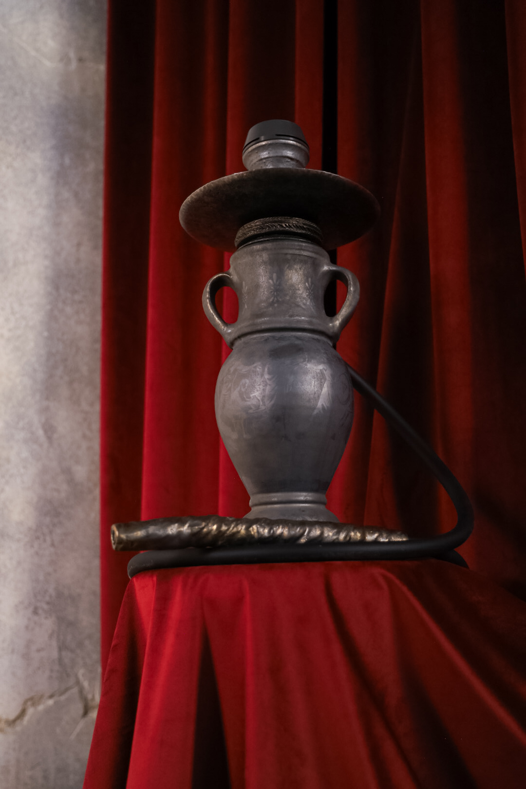 The hookah includes a hand-forged metal tray that adds a distinctive character to the overall design. A high-quality silicone hose is used to ensure easy cleaning and maintenance.