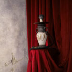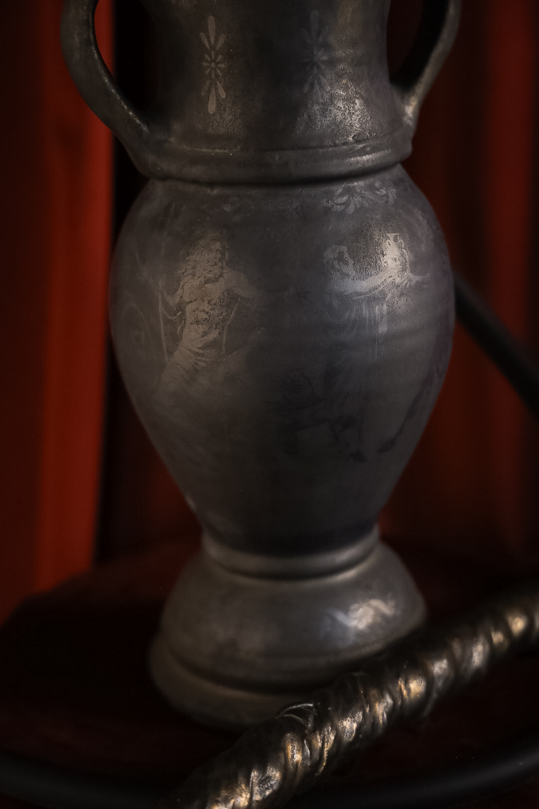A project inspired by the land of the rising sun, the vase is decorated with glaze in the colors of the sunrise, or the spring motif of flowers and a sakura tree before it blooms. The vase is set into the root of trees or pieces of vine trunk, as is the mouthpiece, which is connected to the vase with a black leather hose. The non-return valve is in the form of a dragon of the Far East, serpentine in shape, smoke flows from its mouth.