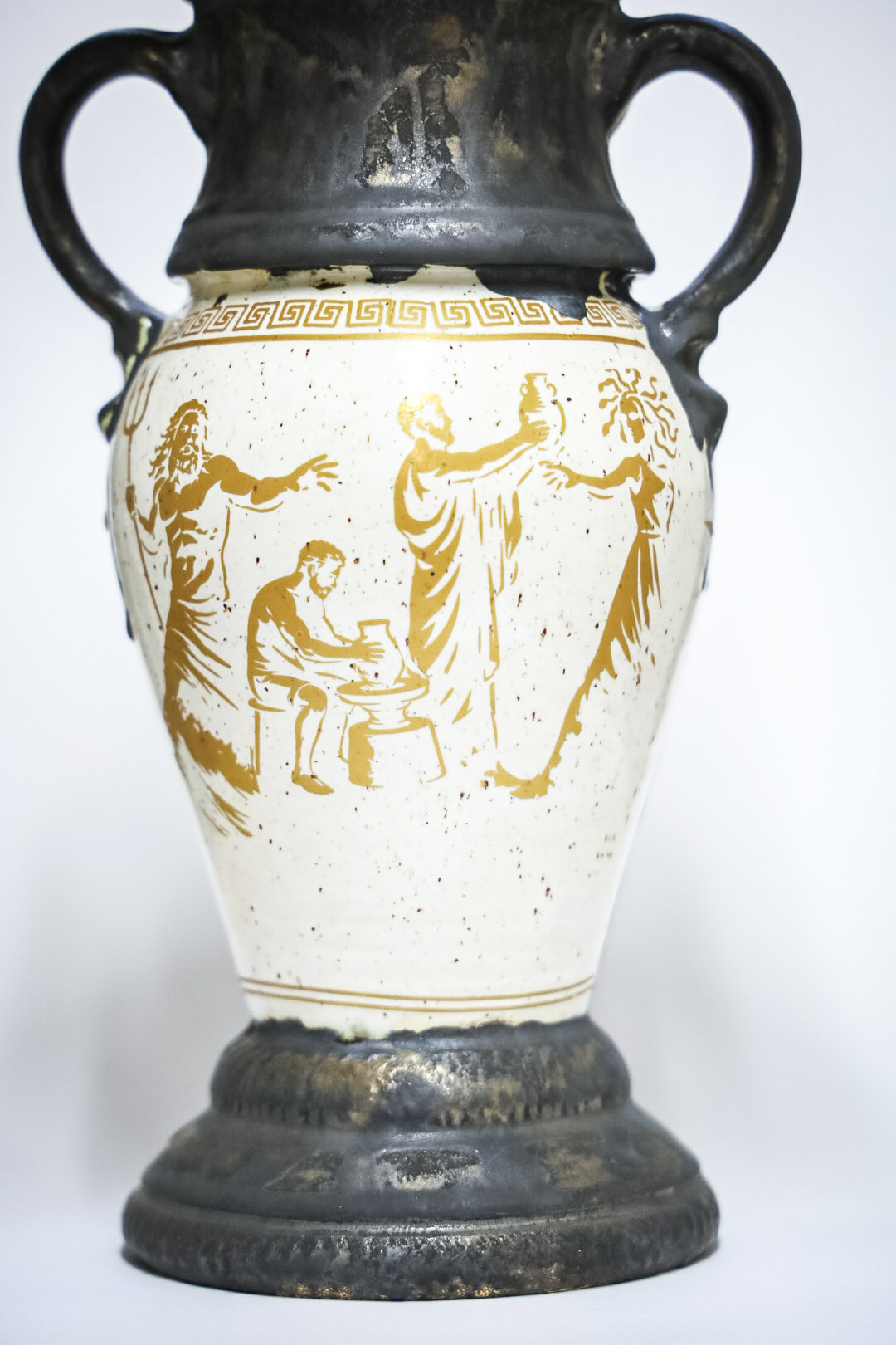 On the shore of a raging sea stands Poseidon. In his hand he grips his trident and, with quiet power, strikes it into the earth. From the place of impact a wave bursts forth, and from the depths a lump of wet clay slowly rises.